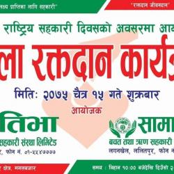 ६२औं राष्ट्रिय सहकारी दिवसको अवसरमा निम्न मिति, समय र स्थानमा खुल्ला रक्तदान कार्यक्रम आयोजना गर्न लागिएको हुँदा सम्पूर्ण सदस्य महानुभाबहरु, सहकारीकर्मी तथा ईच्छुक सबैलाई आफ्नो अमुल्य रक्तदान गरि पुण्य कमाउनुहुन अनुरोध गरिन्छ ।