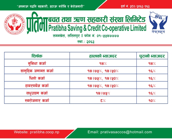 प्रतिभा बचत तथा ॠण सहकारी संस्था लि. को १५ औं वार्षिक साधारणसभा निम्न मिति ,स्थान र समयमा हुने भएकोले सम्पुर्ण शेयर सदस्यज्यूहरुलाई उपस्थितिको लागि अनुरोध गरिन्छ ।