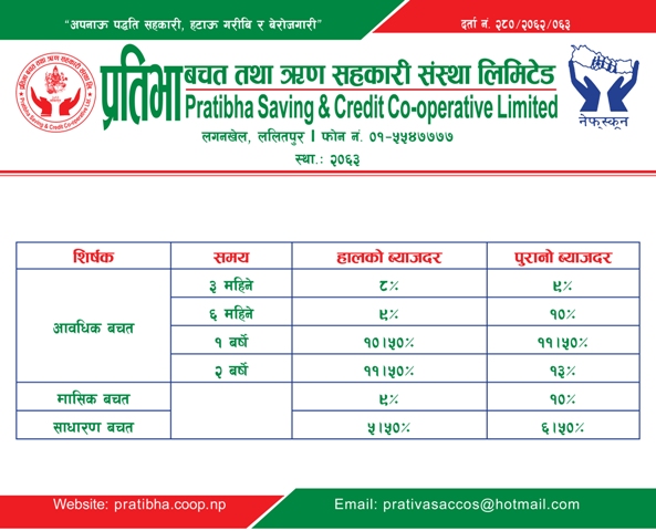 प्रतिभा बचत तथा ॠण सहकारी संस्था लि. को १५ औं वार्षिक साधारणसभा निम्न मिति ,स्थान र समयमा हुने भएकोले सम्पुर्ण शेयर सदस्यज्यूहरुलाई उपस्थितिको लागि अनुरोध गरिन्छ ।