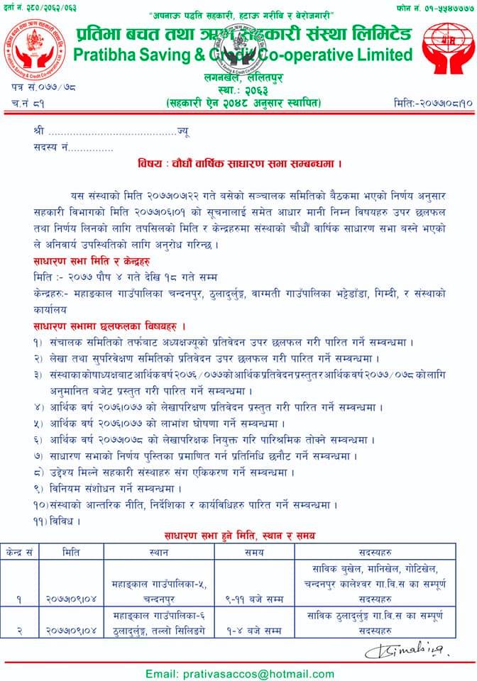 प्रतिभा बचत तथा ॠण सहकारी संस्था लि. को १५ औं वार्षिक साधारणसभा निम्न मिति ,स्थान र समयमा हुने भएकोले सम्पुर्ण शेयर सदस्यज्यूहरुलाई उपस्थितिको लागि अनुरोध गरिन्छ ।